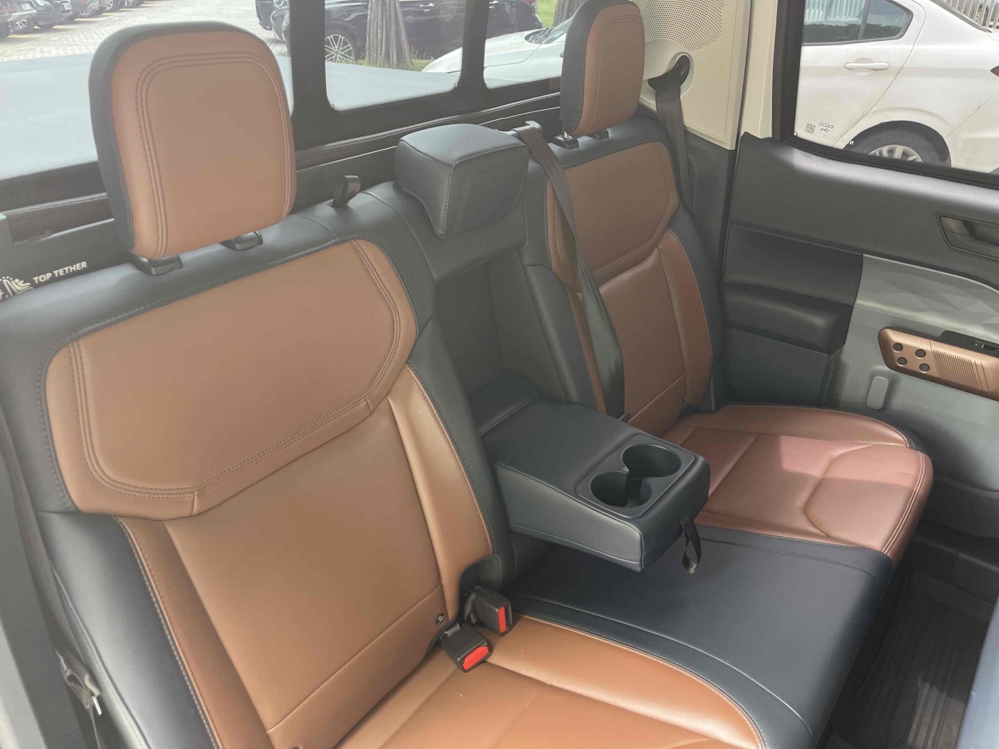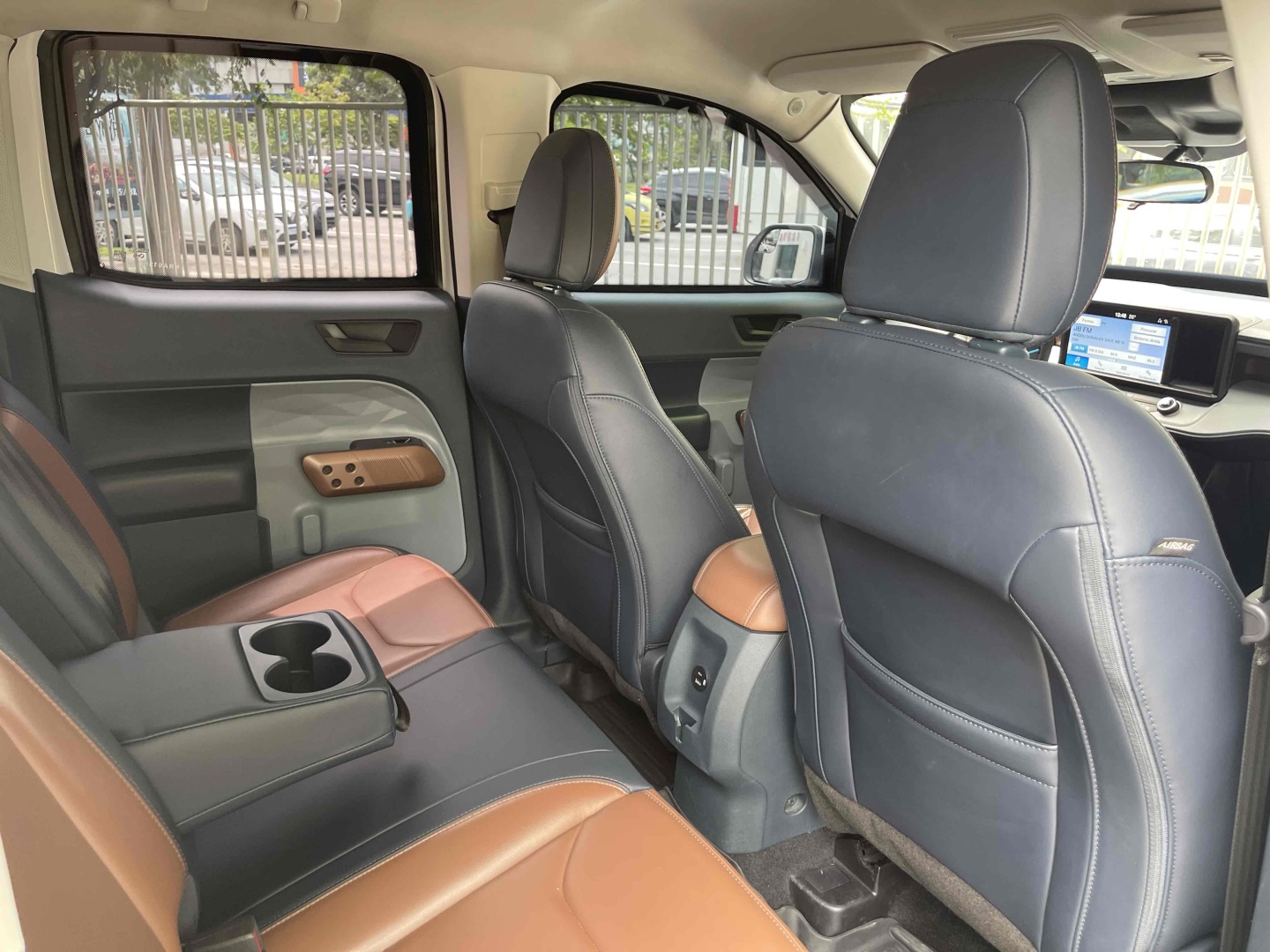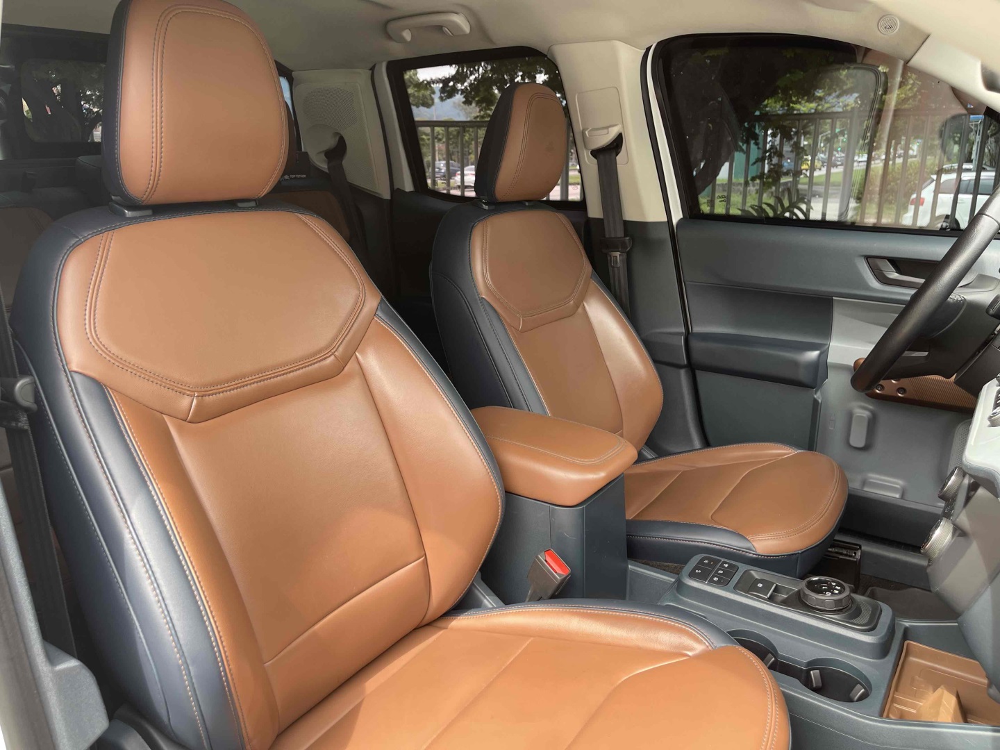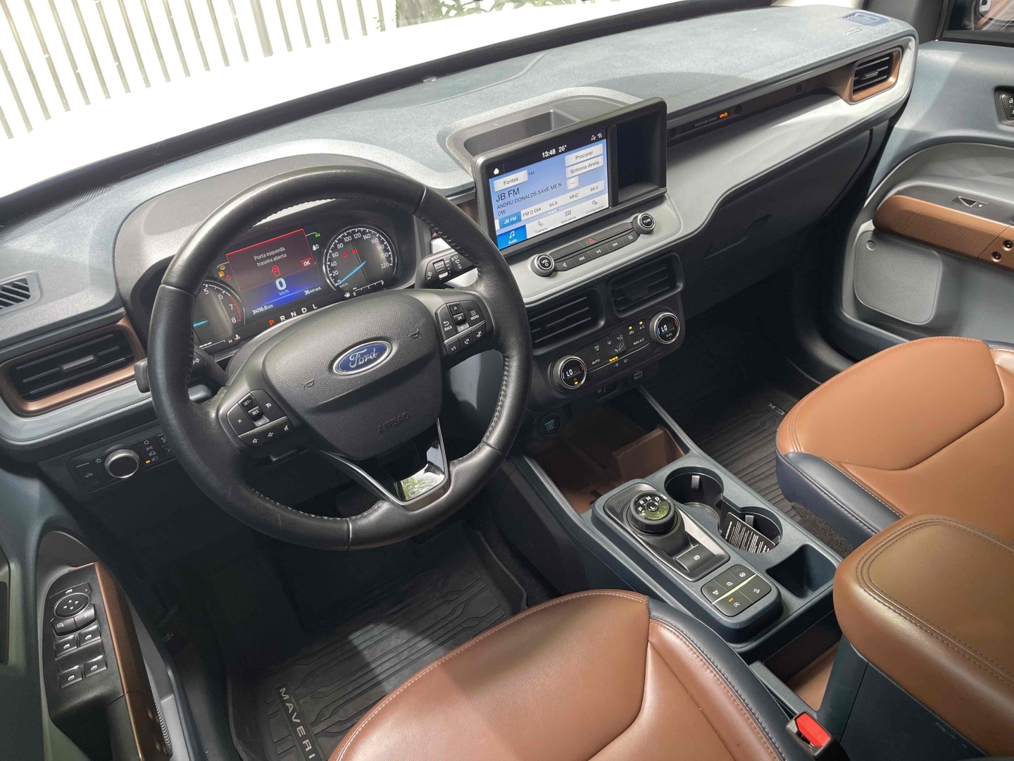 Bancos em couro bicolor Marron e azul com ajustes elétricos.