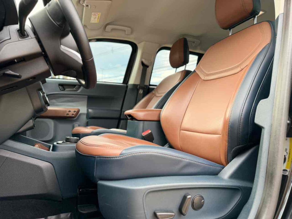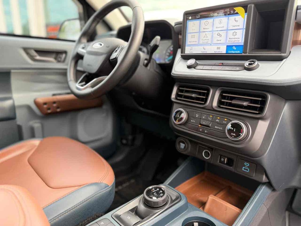 Bancos em couro bicolor Marron e azul com ajustes elétricos.